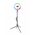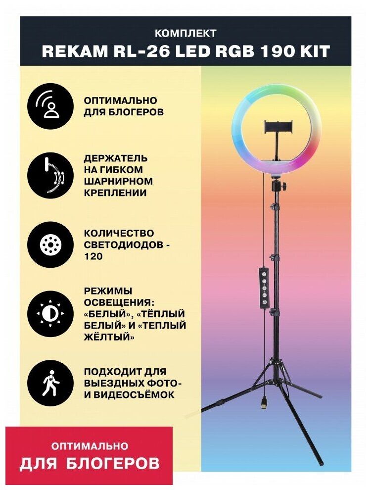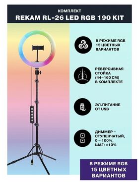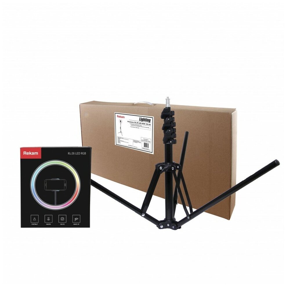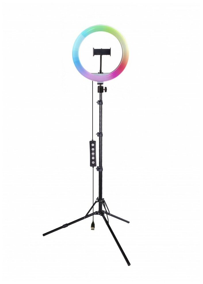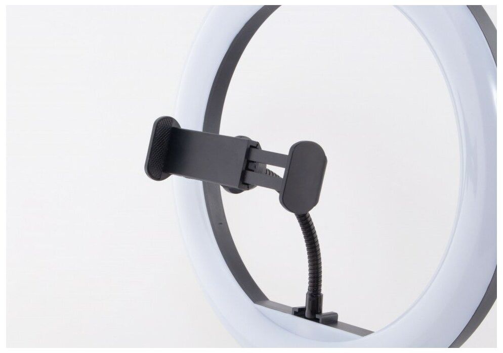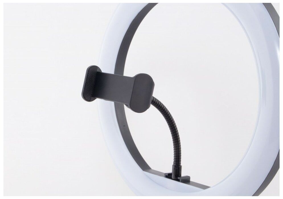 Кольцевая светодиодная лампа. Шнур питания с пультом и USB-разъёмом. Держатель для смартфона. Гибкое шарнирное крепление (Goose neck). Крепление на стойку (штатив) с интегрированной шаровой головой. Винт регулировки угла наклона лампы. Студийная стойка (до 160 см). Инструкция.