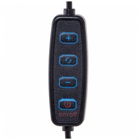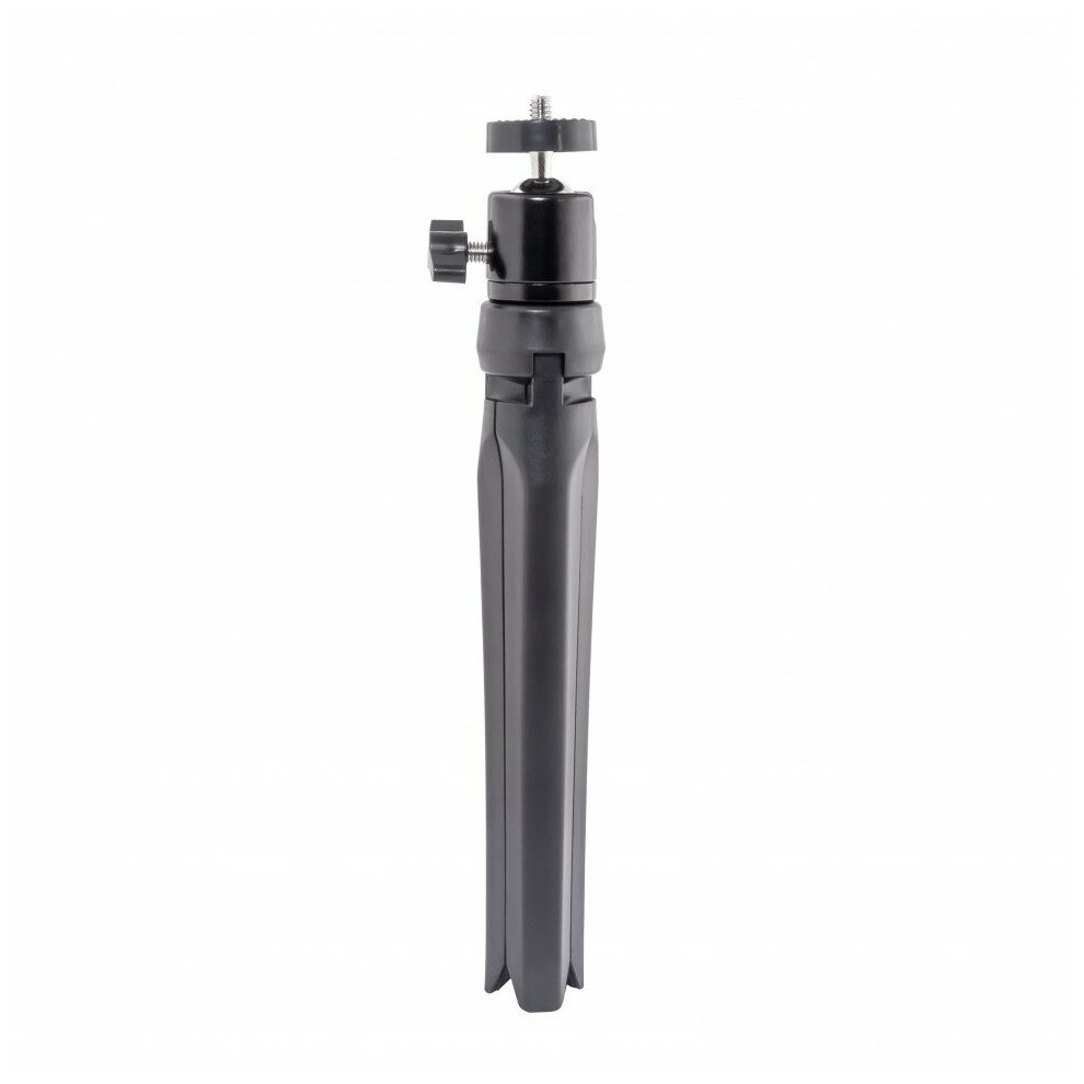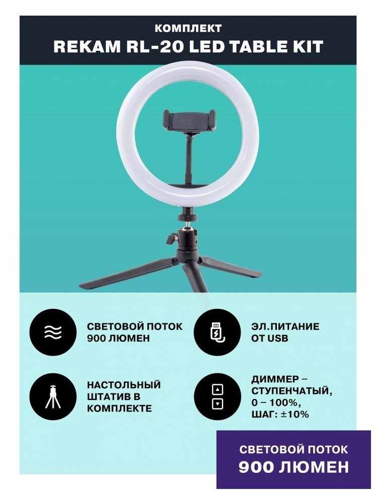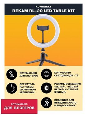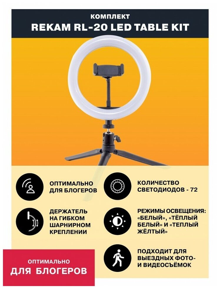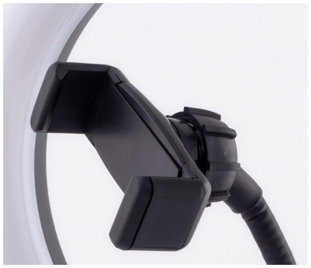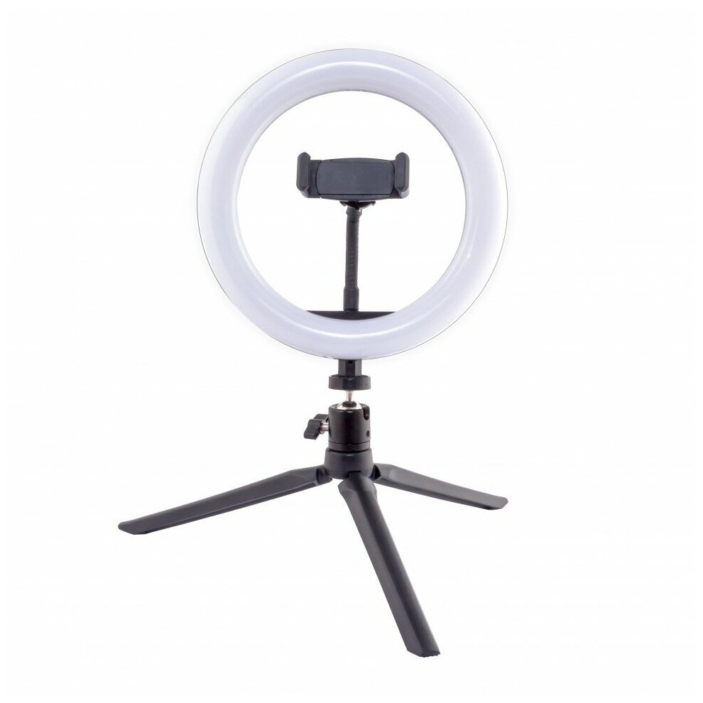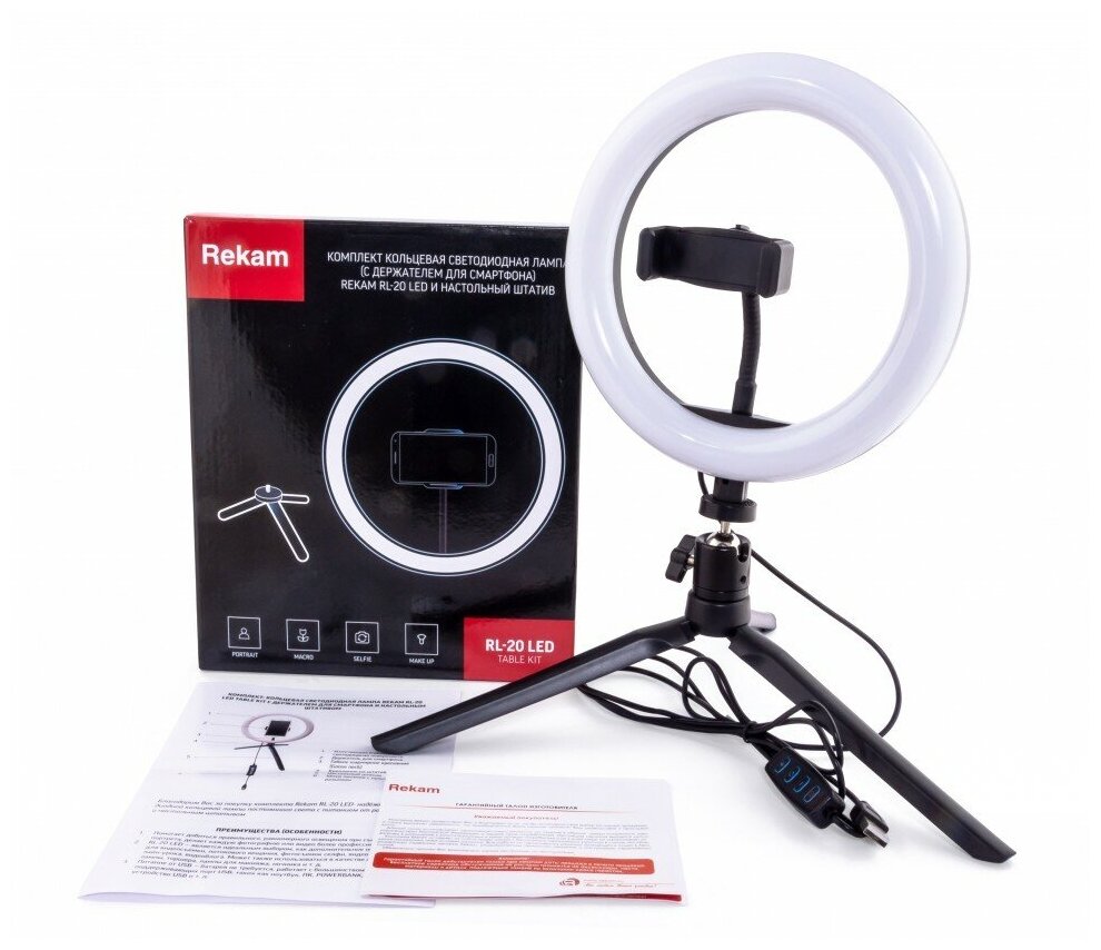 Кольцевая светодиодная лампа. Шнур питания с пультом и USB-разъёмом. Держатель для смартфона. Гибкое шарнирное крепление (Goose neck). Крепление на стойку (штатив) с интегрированной шаровой головой. Винт регулировки угла наклона лампы. Настольный штатив высотой 5 см. Инструкция. Гарантийный талон