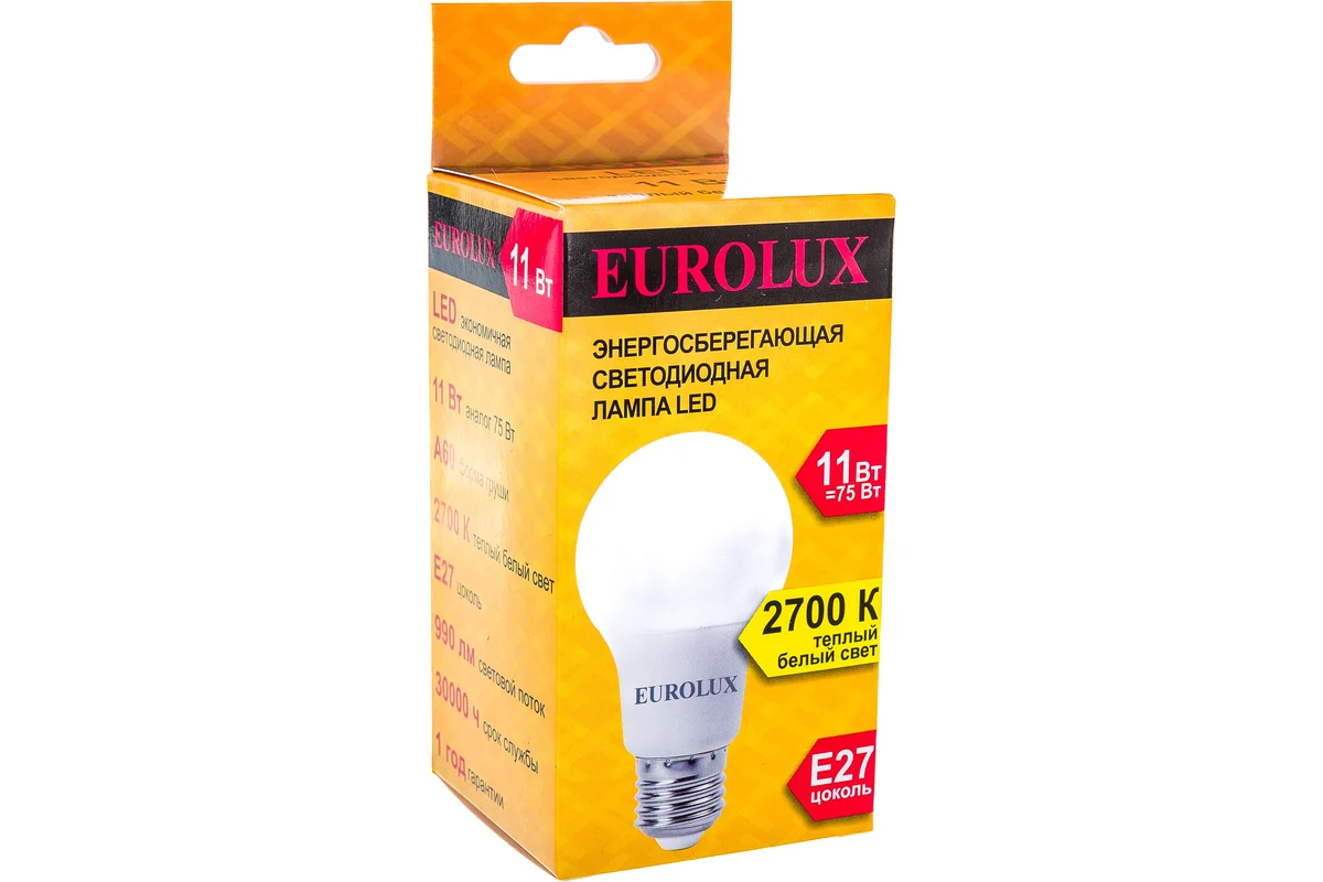 Технические характеристики Eurolux LL-E-A60-11W-230-2,7K-E27 груша, 11Вт, теплый белый, Е27 76/2/15
