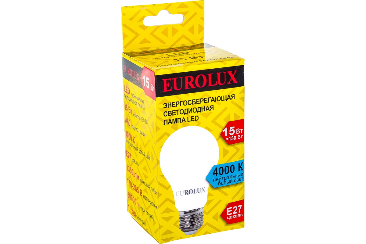 Технические характеристики Eurolux LL-E-A60-15W-230-4K-E27 груша, 15Вт, нейтральный, Е27 76/2/20