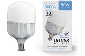 Лампа Gauss Basic, T160, AC180-240V, 90W, 8600lm, 6500K, E40, LED, 1/6 11734392 используется в освещении помещений большой площади и высокими потолками (от 3,5 метров), а также уличных системах освещения. Высокая мощность и большой световой поток при минимальном энергопотреблении.