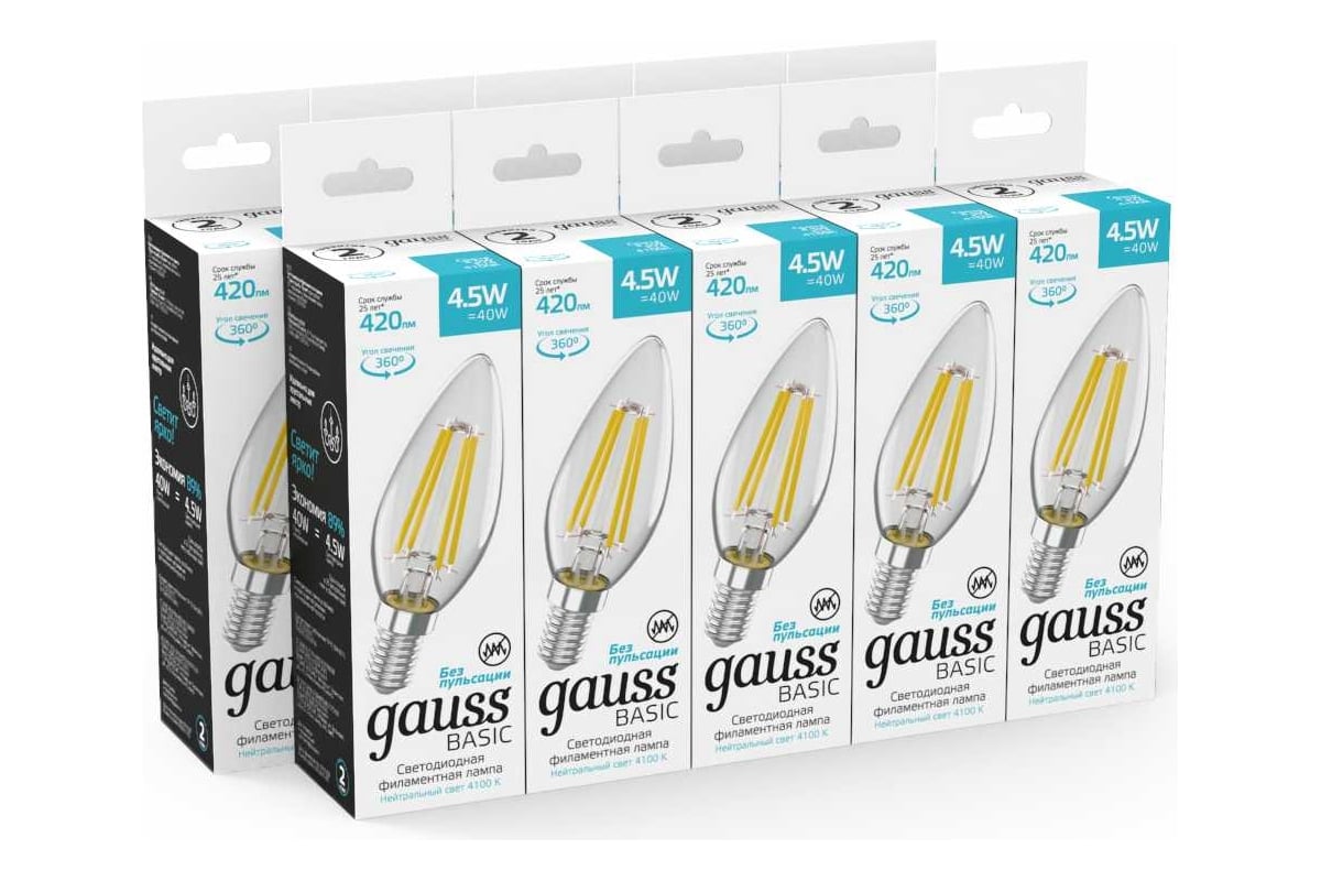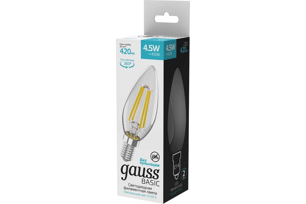 Технические характеристики Gauss Basic Filament свеча, 4,5W, 420lm, 4100К, Е14, LED 1031215