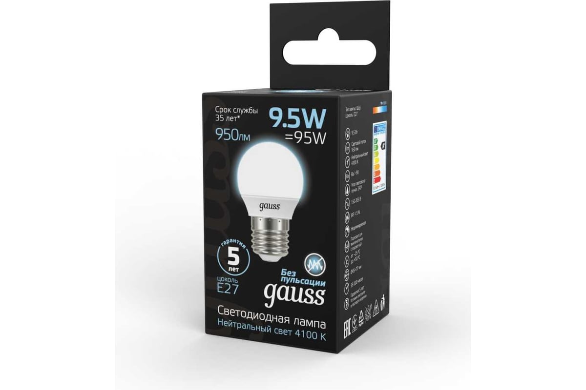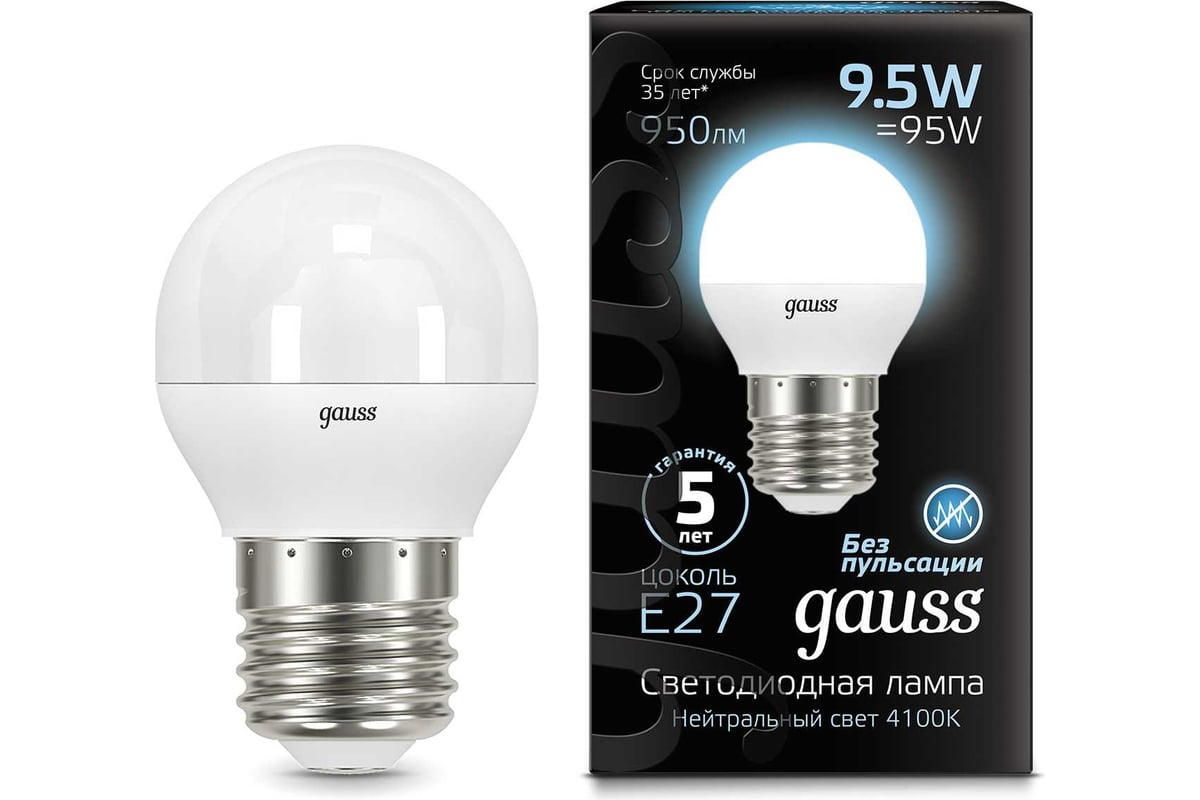 Лампа GAUSS LED Шар E27 9.5W 950lm 4100K 105102210 обеспечивает надежную и стабильную работу в течение всего срока службы. За счет равномерного распределения света по всему пространству этот тип освещения более комфортный для глаз и способствует снижению утомляемости. Благодаря высокому индексу цветопередачи свет лампы передает естественные цвета и оттенки.