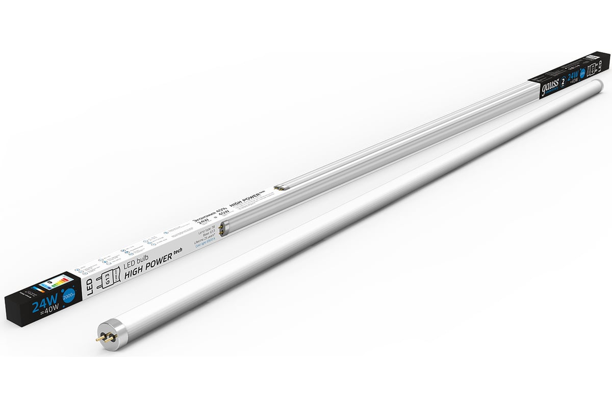 Лампа GAUSS Elementary, T8, 24W, 2000lm, 6500K, G13, 1200mm, стекло, LED, 1/20 93034 - выгодная замена стандартных люминесцентных ламп. Она имеет нормативную длину и без специальных доработок заменят люминесцентные лампы, поскольку устанавливается в стандартные светильники с патроном G13.