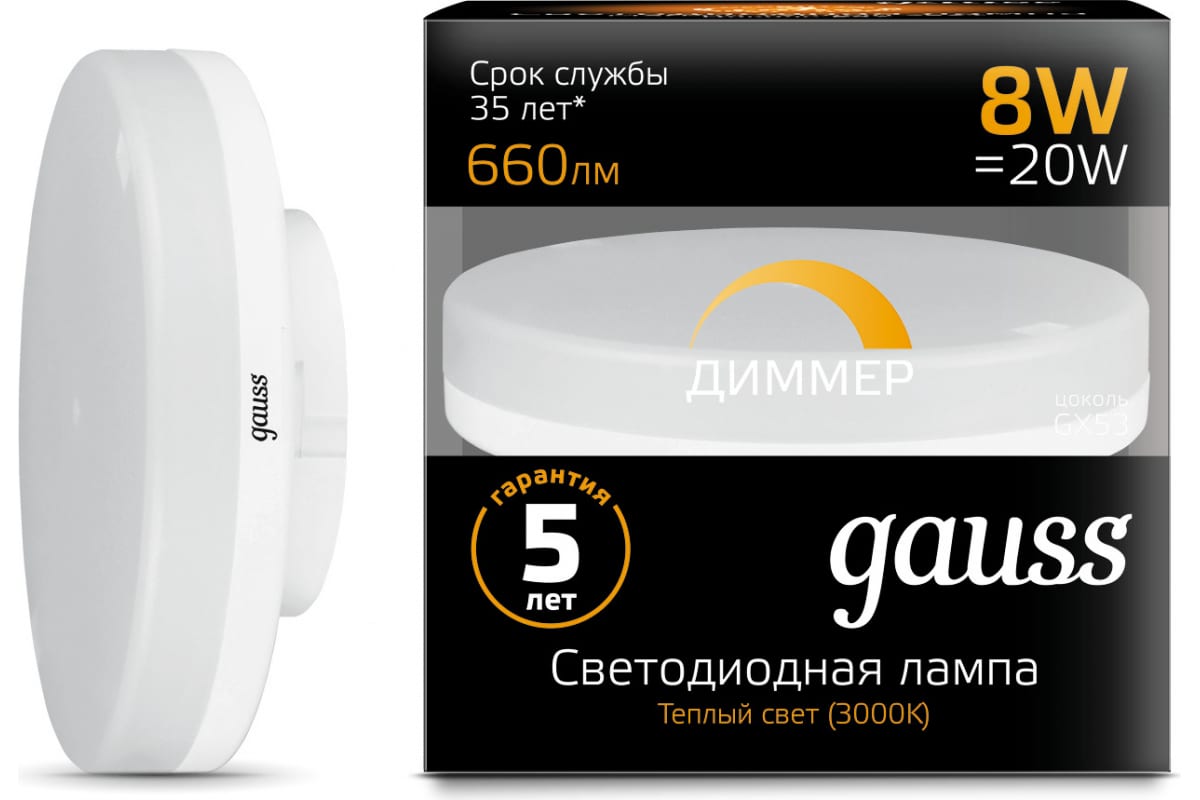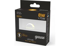 Светодиодная лампа Gauss GX53 8W 660lm 3000K диммируемая LED 1/10/100 108408108-D - современное решение для натяжных, подвесных и реечных потолков. Лаконичный дизайн и простота гармонируют с различным типом потолков.
