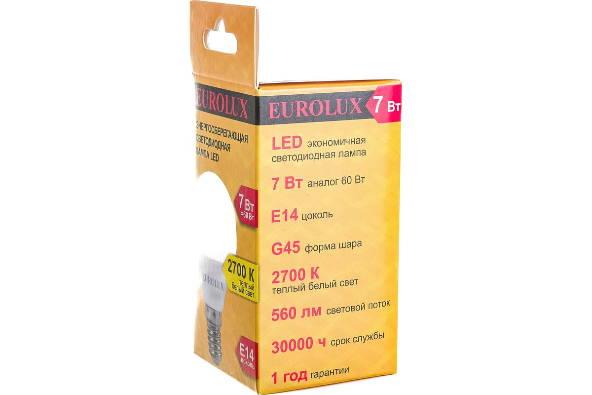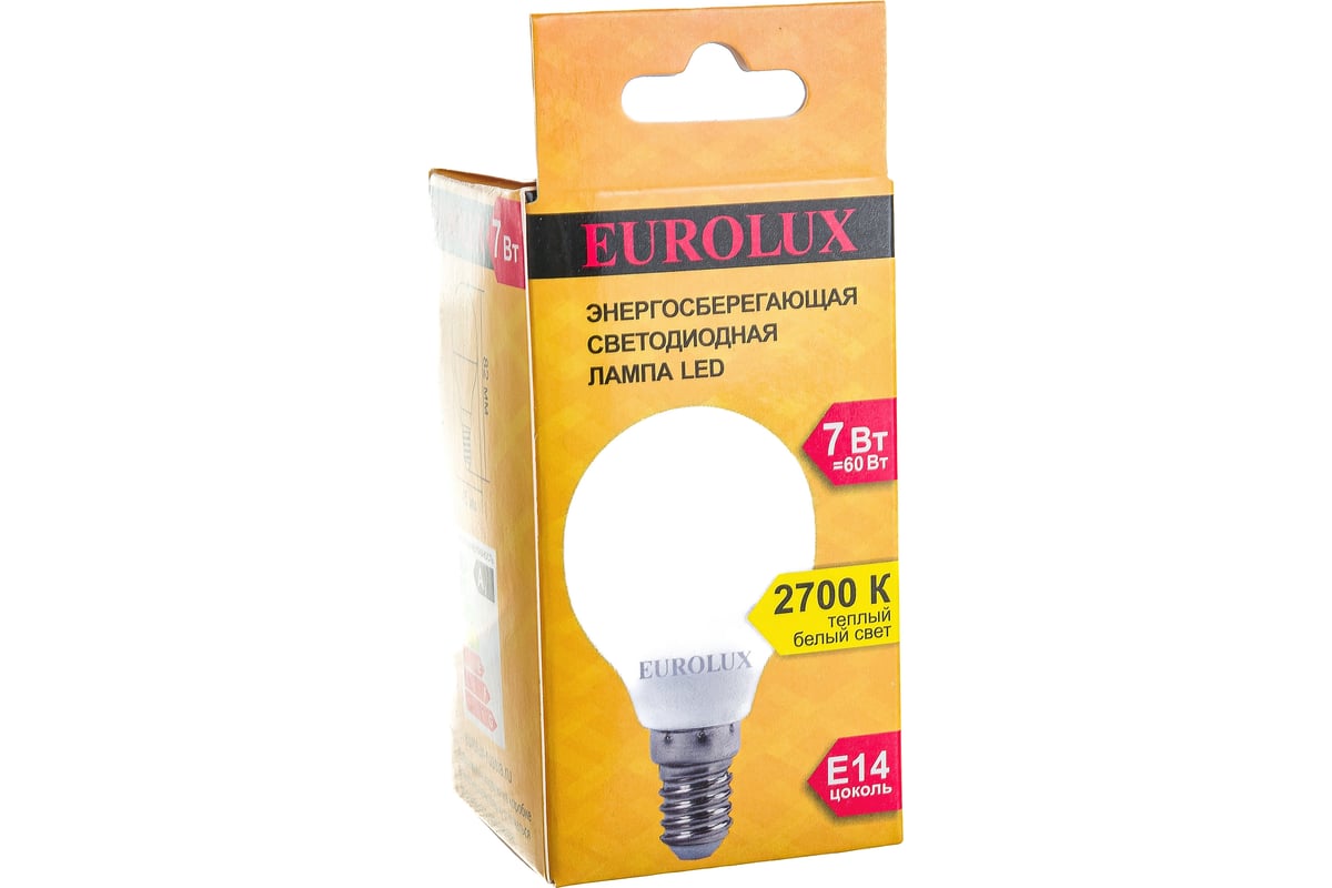 Технические характеристики Eurolux LL-E-G45-7W-230-2,7K-E14 шар, 7Вт, теплый белый, Е14 76/2/5