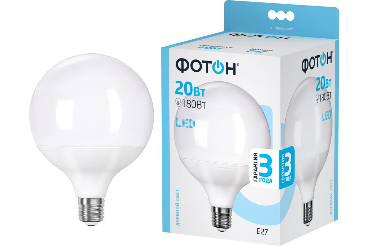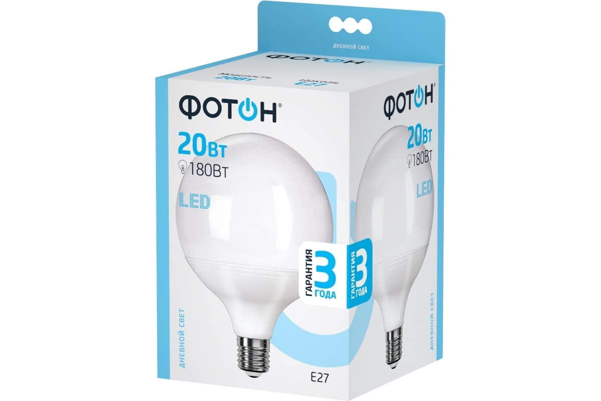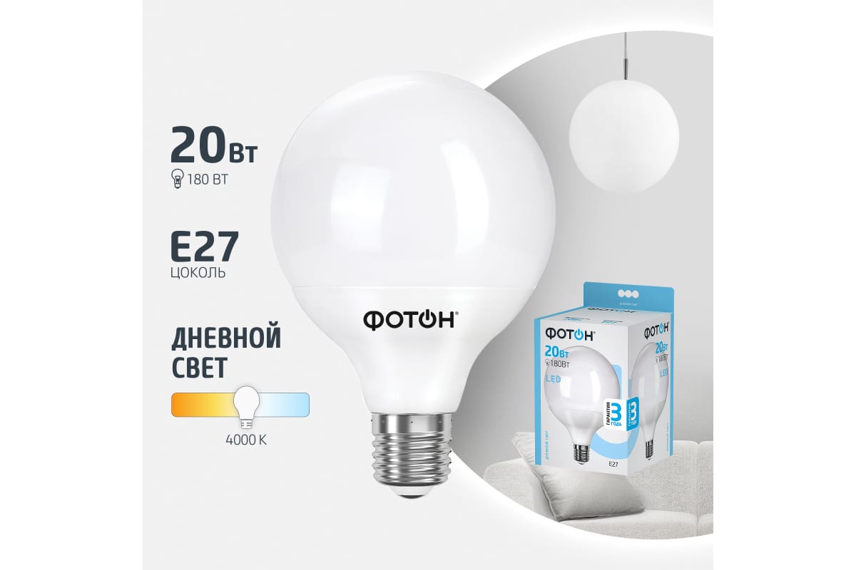 1.Светодиодная лампа ФОТОН LED G120 20W E27 4000K 23953 нагревается меньше, чем лампы накаливания и галогенные лампы.