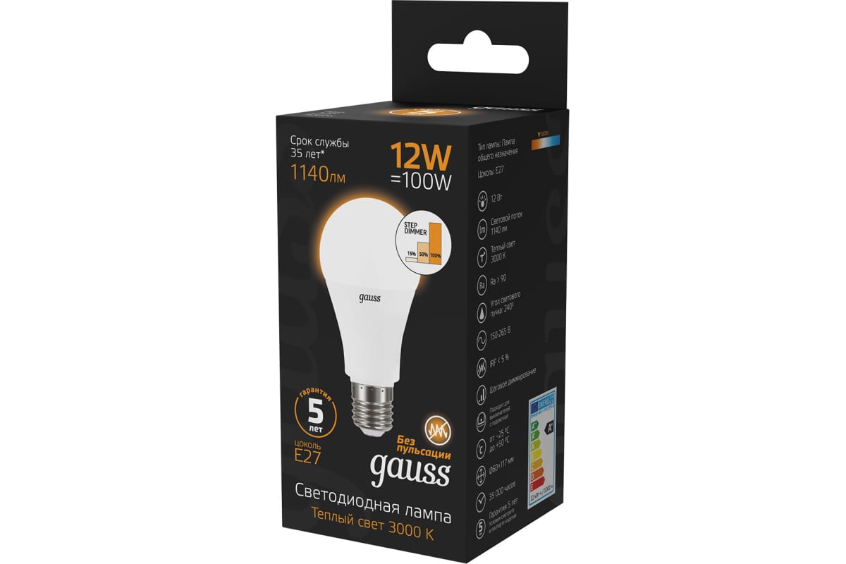 Технические характеристики Gauss A60 12W 1140lm 3000K Е27 шаговое диммирование LED 102502112-S