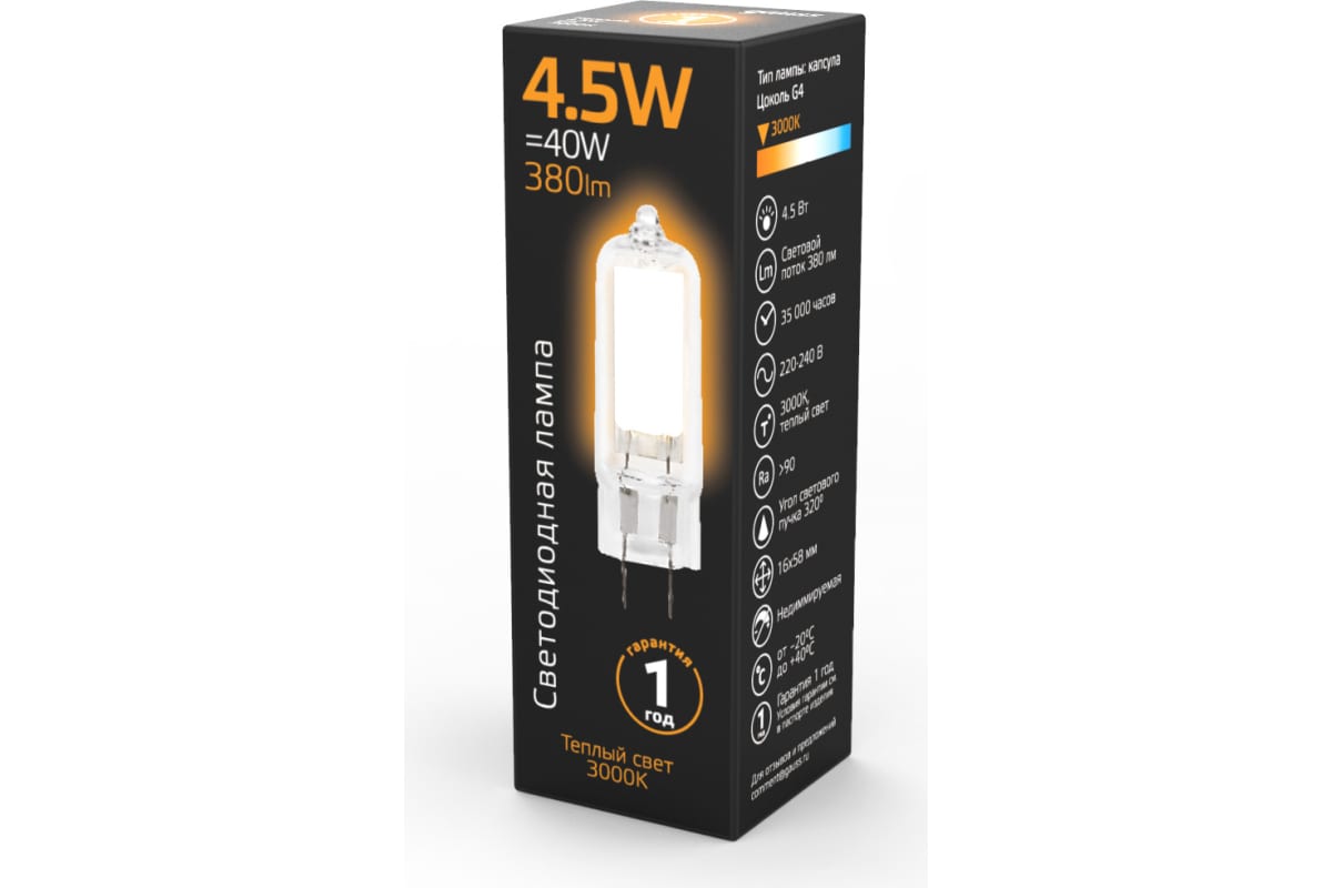 Светодиодная лампа Gauss G4 AC220-240V 4.5W 380lm 3000K стекло LED 1/10/200 107807104 - это миниатюрный капсульный источник света. Такие лампы отличаются невероятной компактностью и дают яркое свечение. Применение новейших светодиодов, обеспечивает большую светоотдачу при меньшем электропотреблении