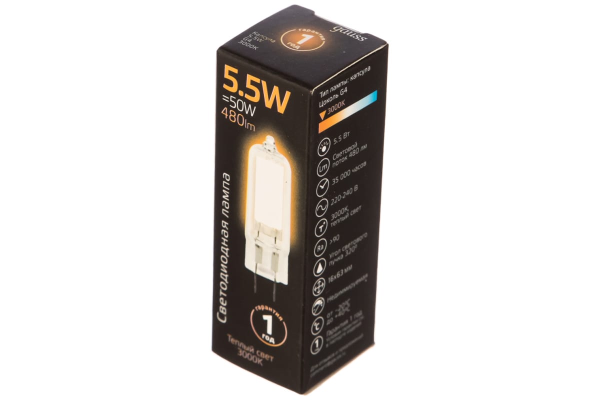 Технические характеристики Gauss LED G4 AC220-240V 5.5W 480lm3000K Glass 107807105