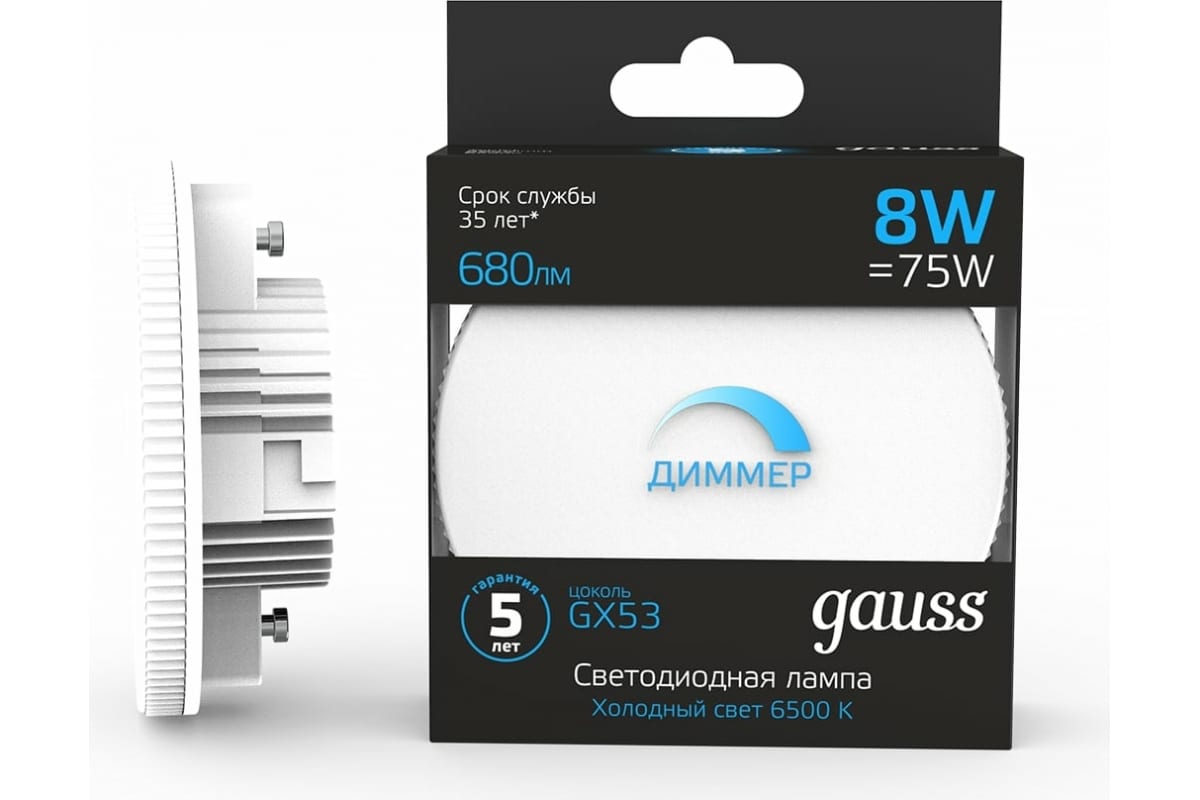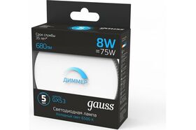 Лампа Gauss GX53 8W 680lm 6500K диммируемая LED 1/10/100 108408308-D - самое лучшее решение для натяжных, подвесных и реечных потолков. Лаконичный дизайн и элегантная простота отлично гармонируют с различными потолками. Малое энергопотребление, и хорошие технические характеристики.