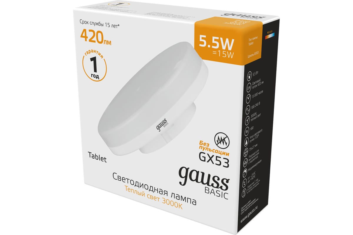 Технические характеристики Gauss BASIC LED, GX53, 5,5W, 420lm, 3000K 10849162