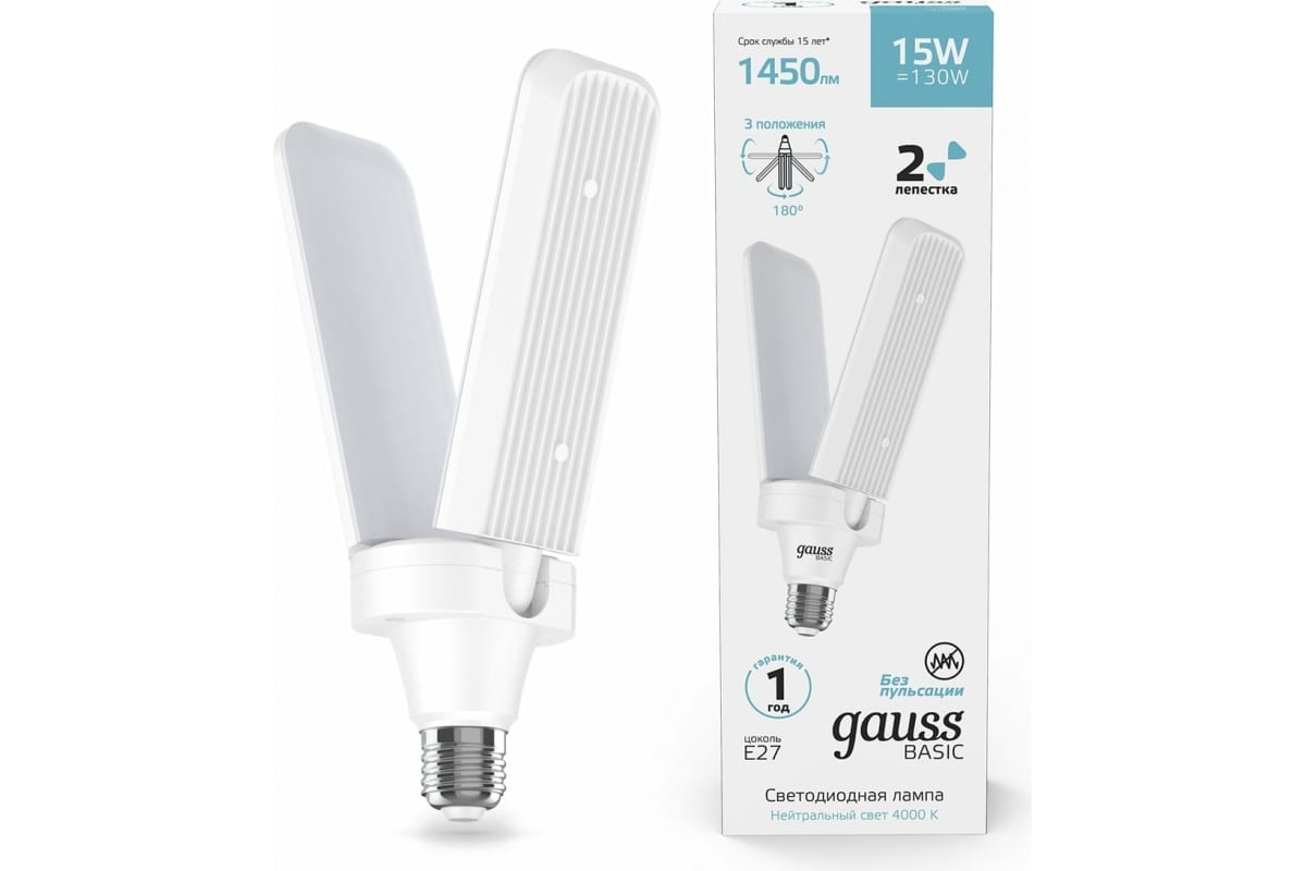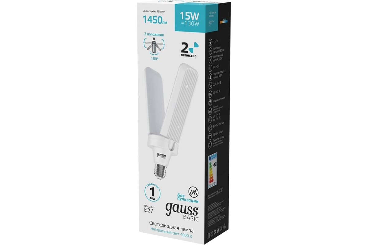 Лампа Gauss Basic 15W 1450lm 4000K E27 Клевер-2 LED 1/20 11732212 имеет три положения работы с возможностью вращения лепестков вокруг своей оси на 180°. Лампа способна осветить большое пространство при меньшем потреблении электроэнергии. благодаря высокоэффективным светодиодам.