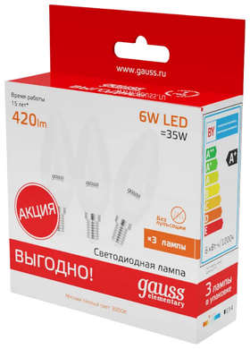 Светодиодная лампа Gauss Elementary Свеча 6W 420lm 3000K E14 (3 лампы в упаковке) LED 1/40 33116T подойдет как для домашнего, так и для коммерческого использования. Такой тип освещения прекрасно смотрится в светильниках без плафонов или устанавливается в люстры и бра. Равномерный спектр света создает зрительный комфорт в любом помещении.