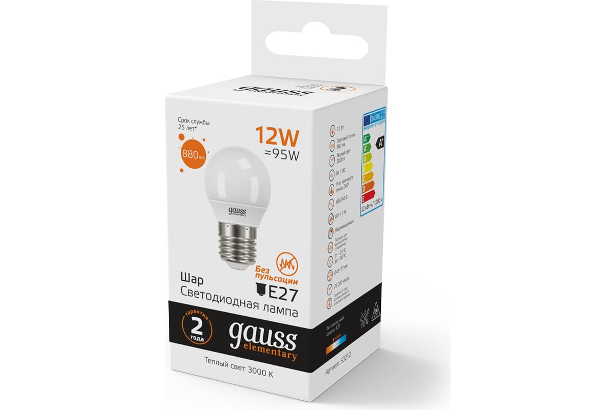 Светодиодная лампа Gauss Elementary Шар 12W 880lm 3000K Е27 LED 1/10/100 53212 является универсальным источником света для любого типа помещений. Матовая колба равномерно рассеивает свет и подходит для открытых светильников и прозрачных плафонов. За счет высокого индекса цветопередачи пространство будет наполнено приятным, мягкий светом, не слепящим глаза. В случае перебоя напряжений лампа не потеряет яркость и не будет мерцать.