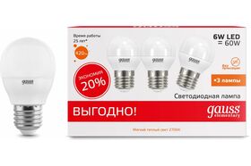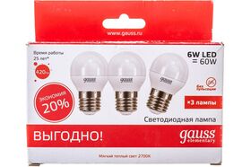 Лампа Gauss LED Elementary Globe 6W E27 2700K 1/40 3 лампы в упаковке SQ53216T является энергосберегающей заменой обычным лампам накаливания. Равномерное распределение света создает зрительный комфорт в любом помещении.