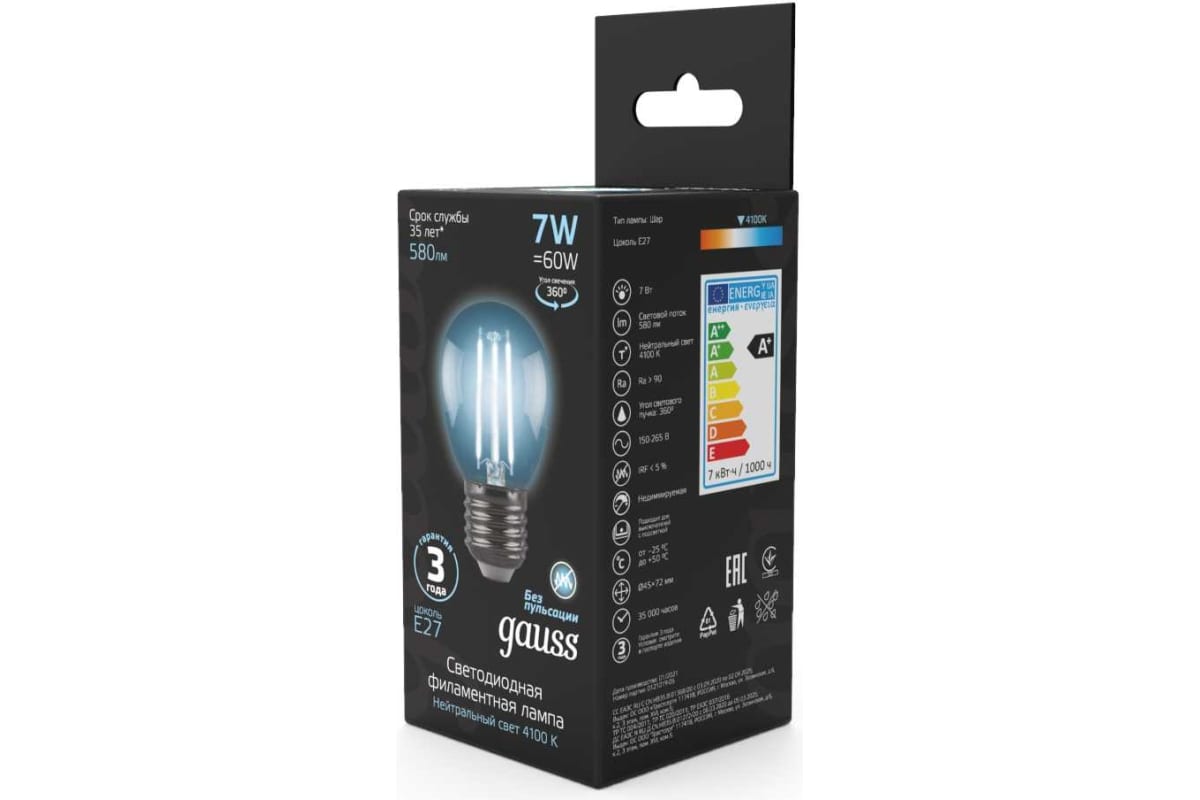 Технические характеристики Gauss LED Filament Шар E27 7W 580lm 4100K 105802207