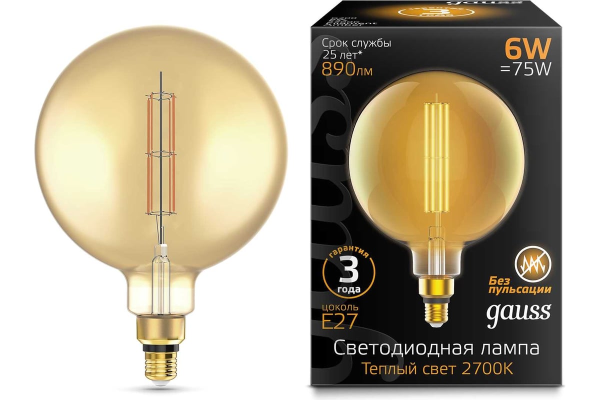Технические характеристики Gauss Vintage Filament Straight G200 LED 6W E27 200x283mm Amber 890lm 2700K 154802118