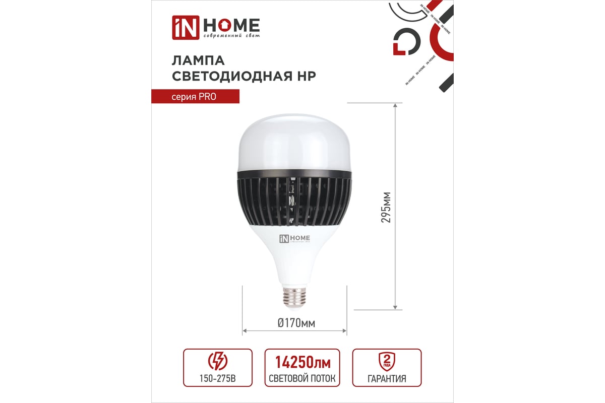 Светодиодная лампа IN HOME LED-HP-PRO 150Вт 230В E27 с адаптером Е40 6500К 14250Лм 4690612035703 применяется для общего и локального освещения производственных и общественных помещений.