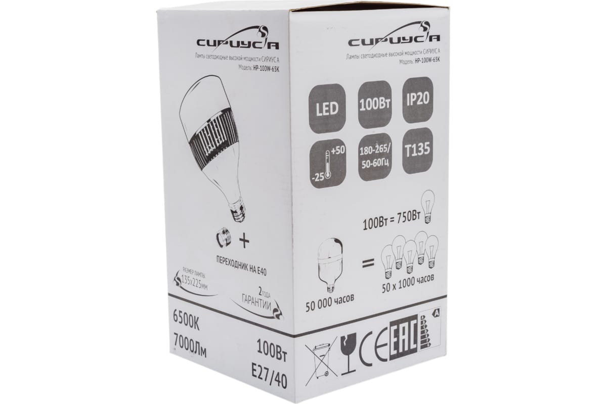 Светодиодная лампа высокой мощности Сириус А HP 100W 6500K 7000Лм E27 (+переходник на Е40) HP-100W-65K является прямой заменой старых ртутных ламп высокого давления ДРЛ и ДРВ и натриевых ламп высокого давления ДНаТ, а также метелогалогеновых ламп МГЛ.