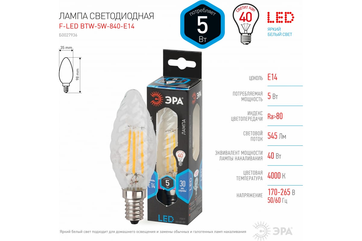 Технические характеристики ЭРА F-LED BTW-5W-840-E14 филамент, свеча витая,нейтр Б0027936