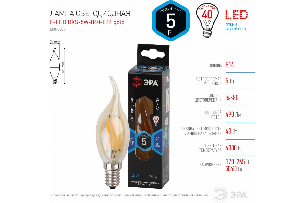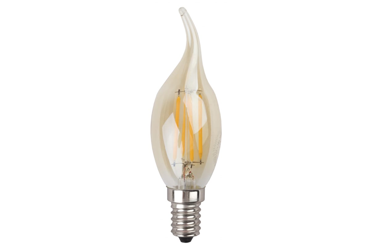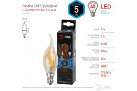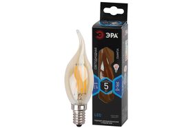 Лампа ЭРА FLED BXS5W840E14 gold, филамент, свеча на ветру, золото, 5Вт, нетр, E14 10/100/4000 Б0047007 - лампа премиального сегмента. Максимально похожа на лампу накаливания, может использоваться в дизайнерских интерьерах. Угол рассеивания светового потока: 360 градусов. Совместима с выключателями с подсветкой.