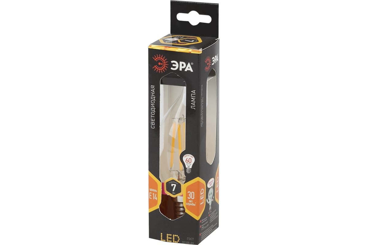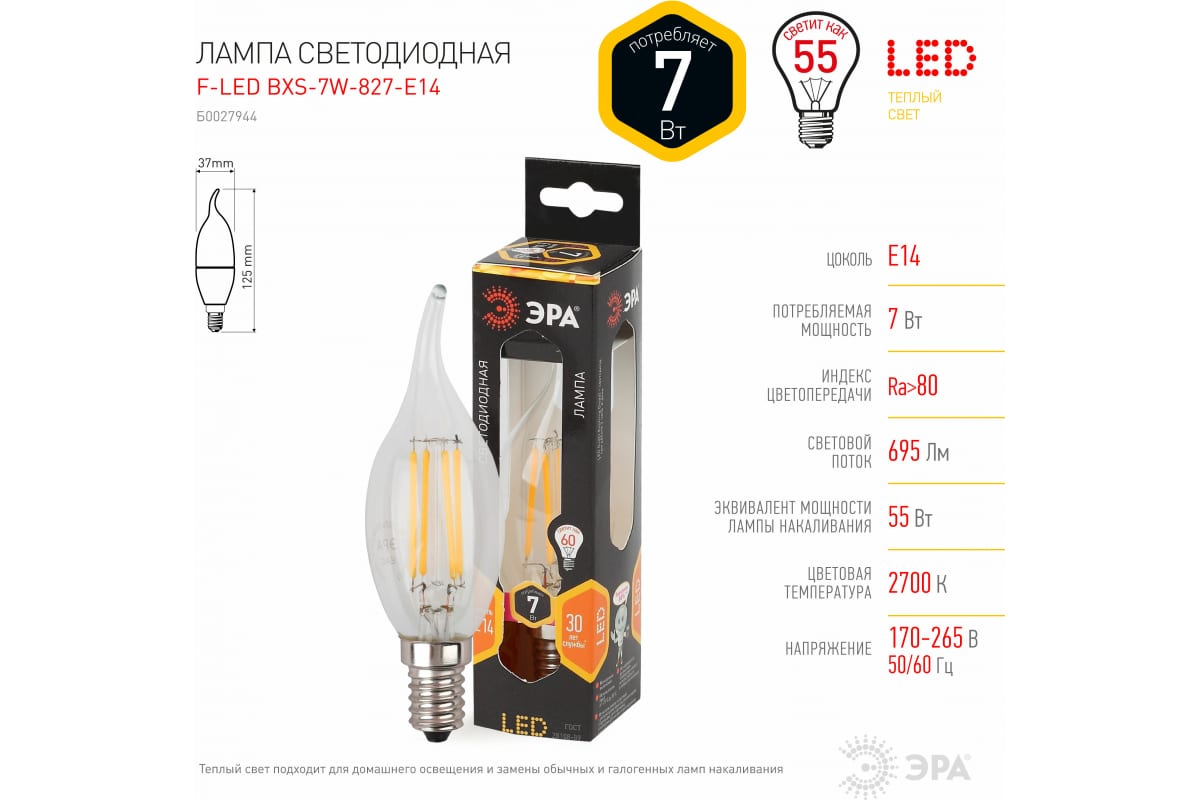 Светодиодная лампа ЭРА F-LED BXS-7w-827-E14 Б0027944 с нитевидными светодиодами серии F-LED. Лампа премиального сегмента. Максимально похожа на лампу накаливания, может использоваться в дизайнерских интерьерах. Угол рассеивания светового потока 360 градусов.