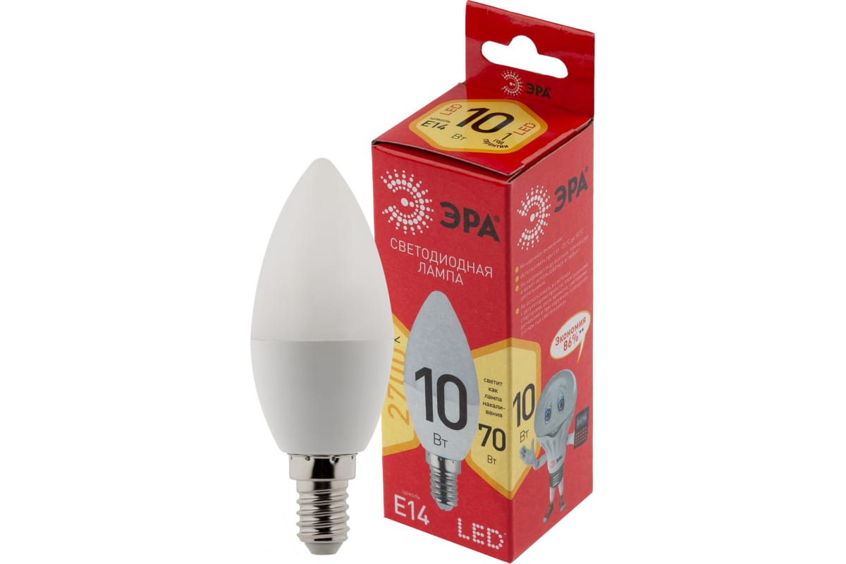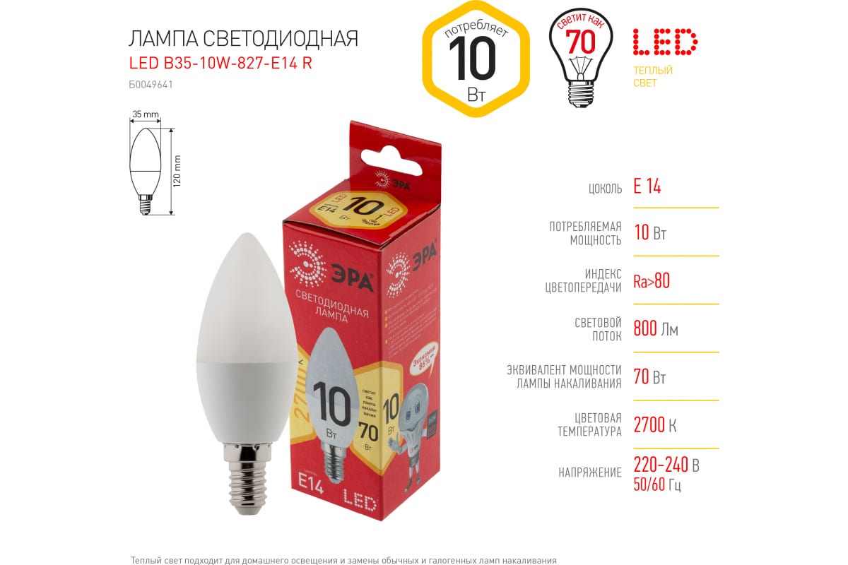 Технические характеристики ЭРА LED B35 10W 827 E14 R диод, свеча, 10Вт, теплый свет, E14 Б0049641
