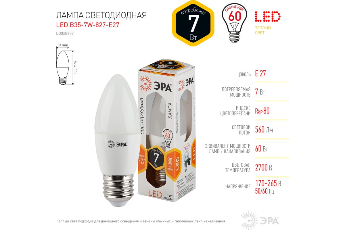 Технические характеристики ЭРА LED B35-7W-827-E27 диод, свеча,тепл Б0028479
