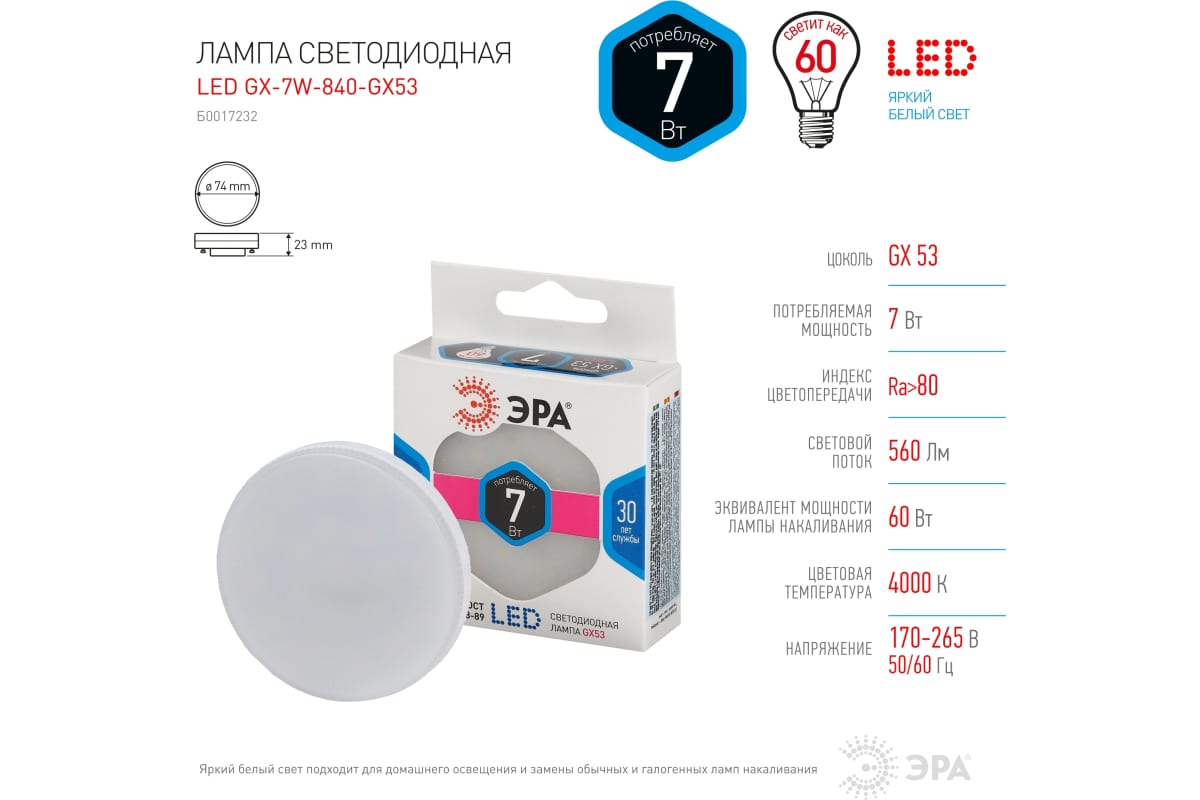 Технические характеристики ЭРА LED smd GX-7w-840-GX53 Б0017232