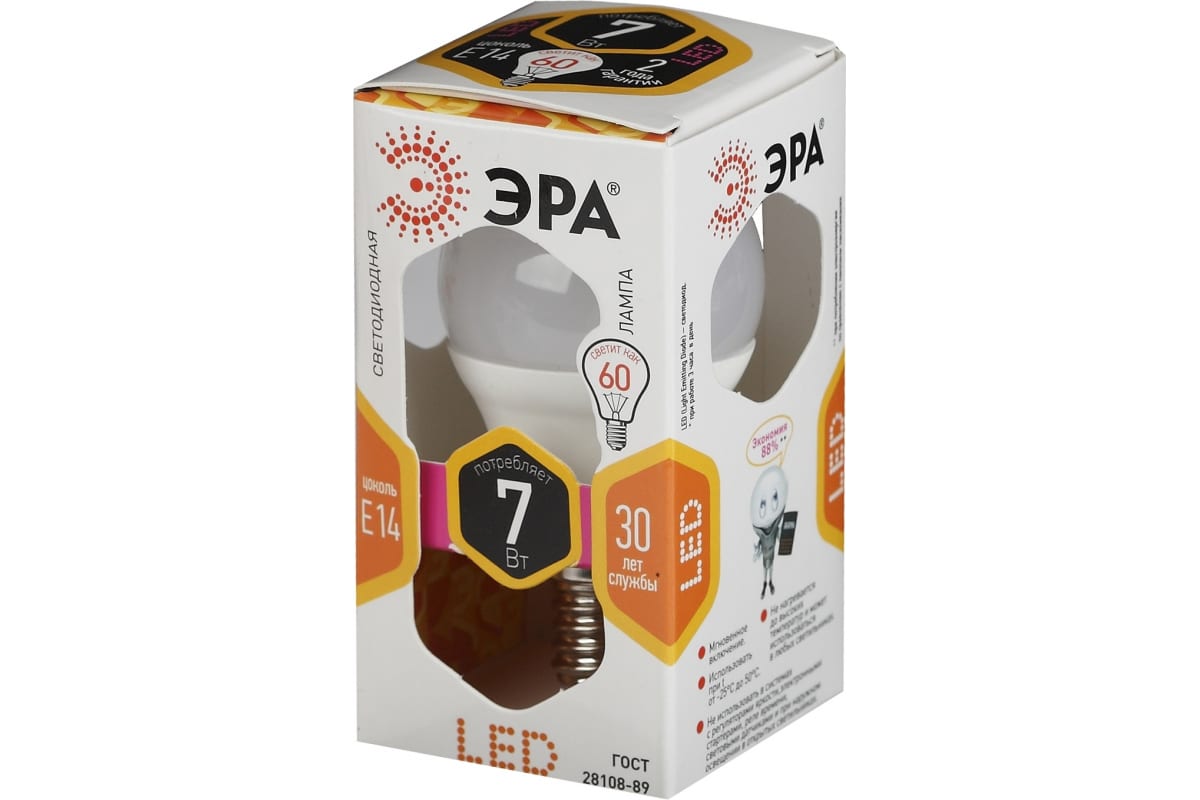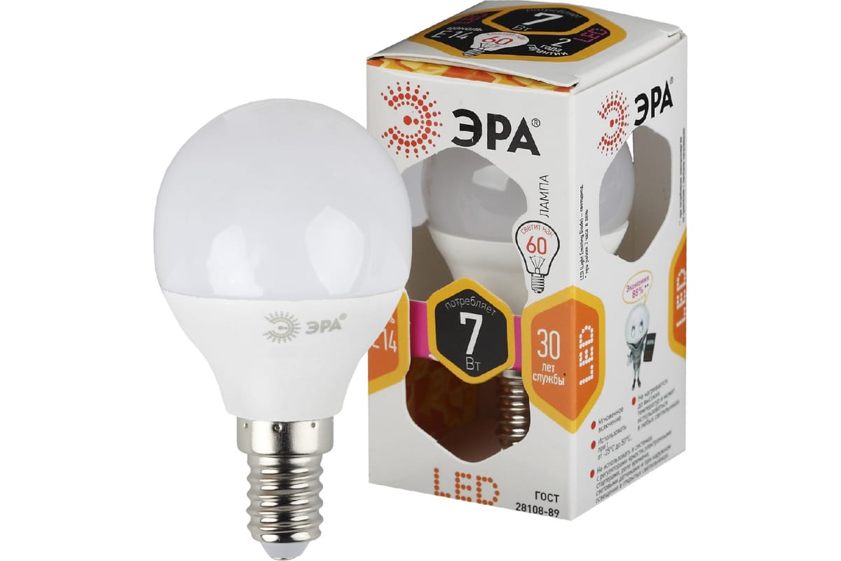 Светодиодная лампа ЭРА LED smd P45-7w-827-E14 Б0020548 создаёт яркое ровное освещение и экономит до 90% электроэнергии по сравнению с лампой накаливания с аналогичным световым потоком. Светит теплым светом с жёлтым оттенком - такая цветовая температура эффективна для отдыха и уютной атмосферы в доме. Используется в потолочных, настенных, настольных светильниках, в люстрах и бра. Мгновенно включается и не нагревается.