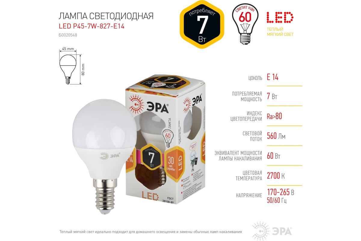 Технические характеристики ЭРА LED smd P45-7w-827-E14 Б0020548