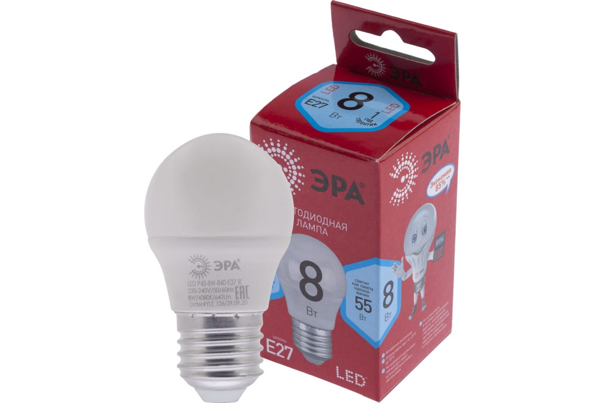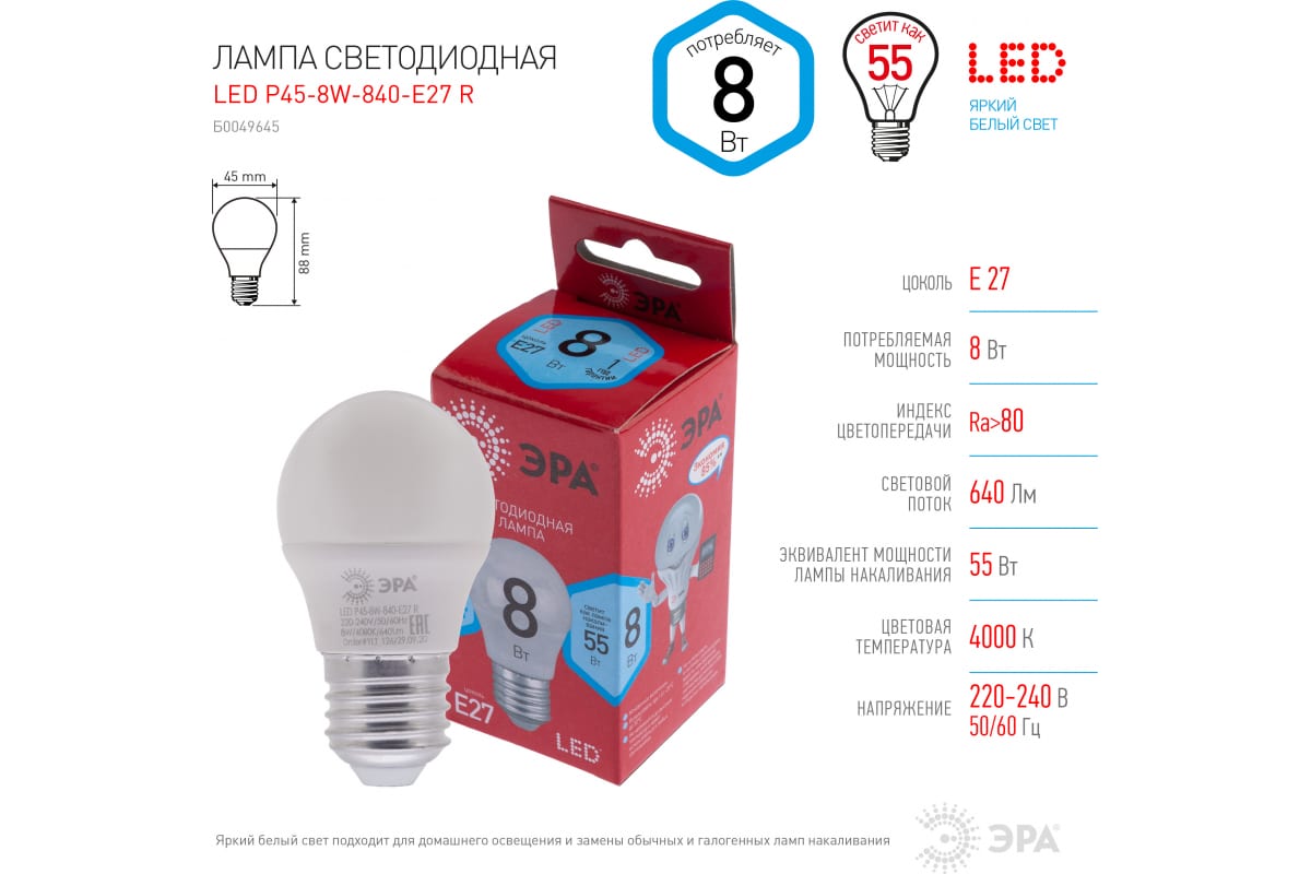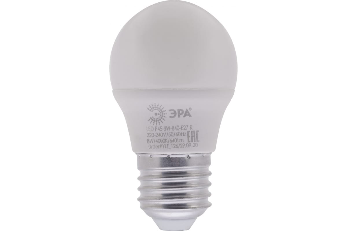 Технические характеристики ЭРА LED P45-8W-840-E27 R шар, 8Вт, нейтральный, E27 Б0049645
