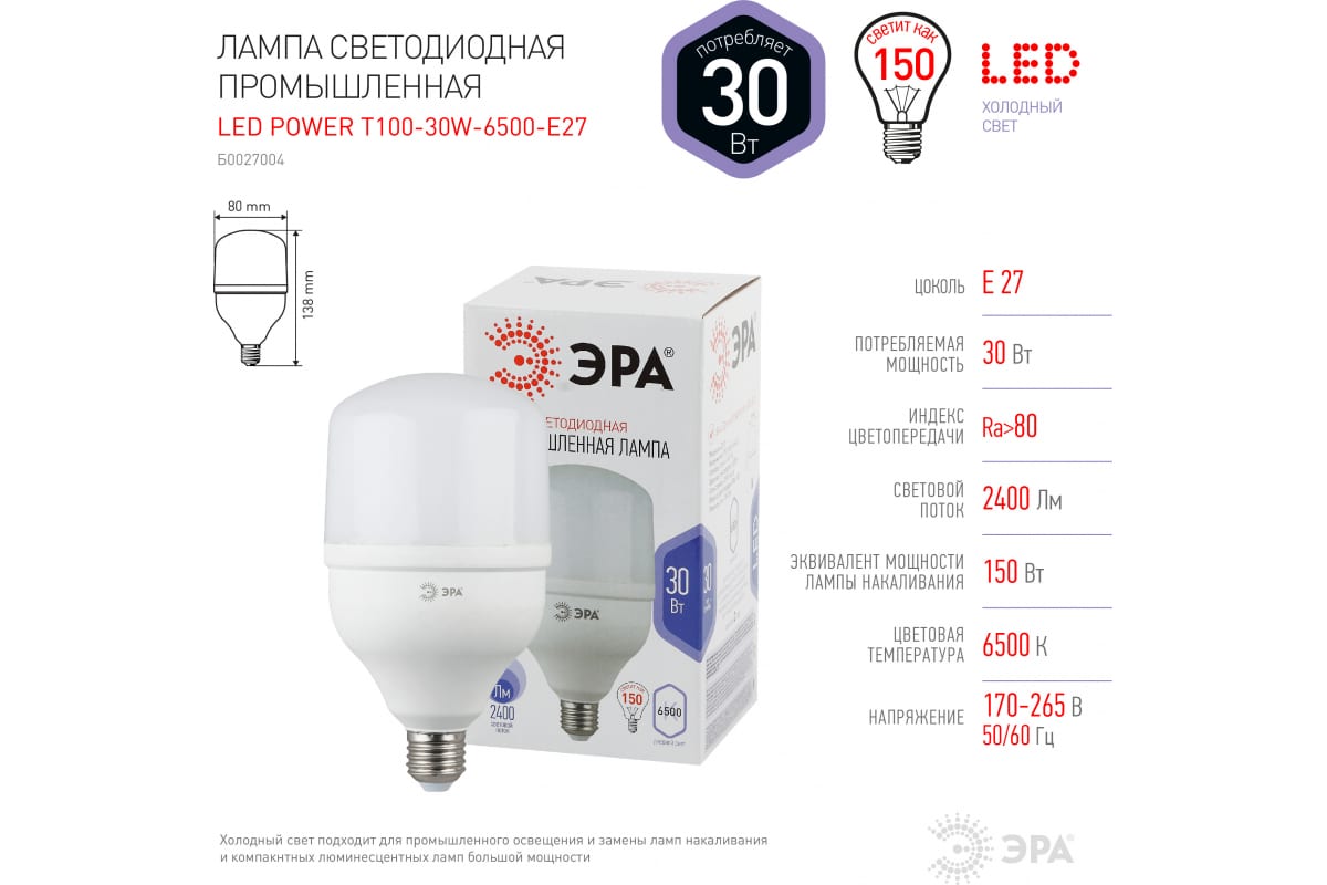 Технические характеристики ЭРА LED smd POWER 30W-6500-E27 20/420 Б0027004