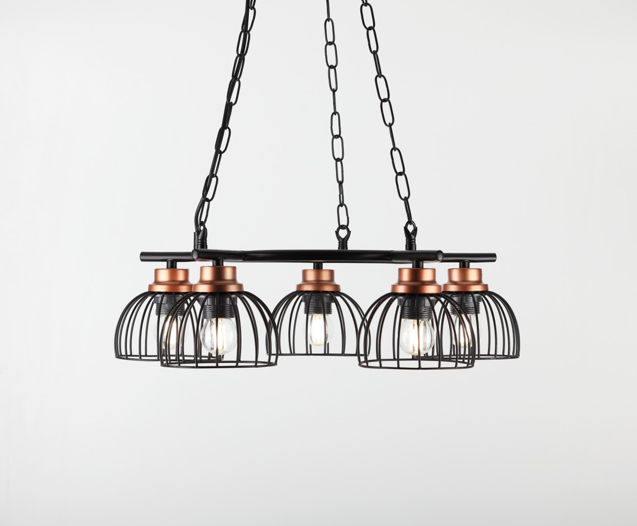 писание Данная коллекция перекликается дизайном с подвесом коллекции Agira. Сочетание черного и бронзы подчеркивает харизму - этот подвес не намерен остаться незамеченным. Коллекция представлена подвесом на пять ламп.