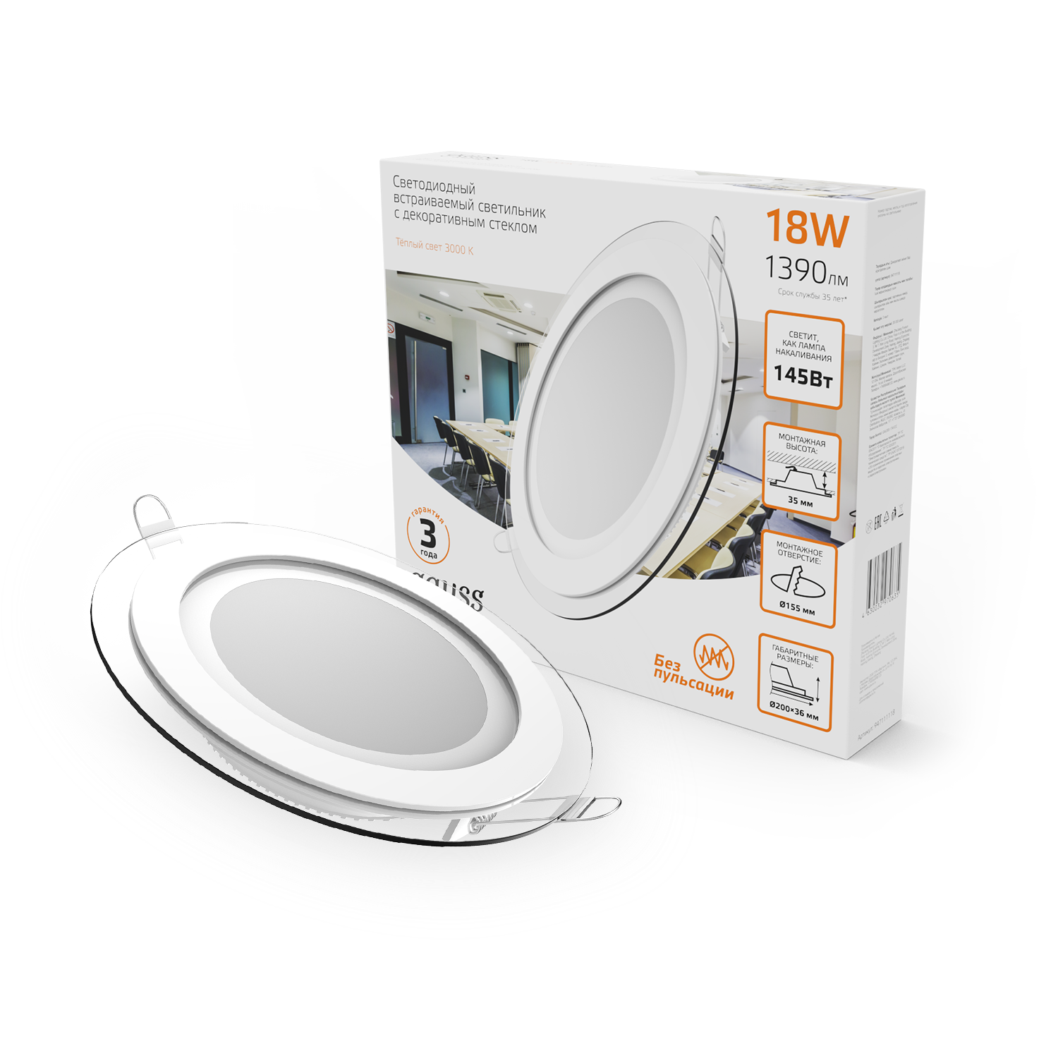 Светильник встраиваемый Gauss Downlight круг с декоративным стеклом и декоративным световым контуром. Мощность 18w, светит как лампа накаливания 145w, цветовая температура 3000К (теплый белый свет), световой поток 1390лм. Корпус выполнен из алюминия, окрашенного в белый цвет. Нейтральный лаконичный дизайн светильника найдет применение на всех видах натяжных, гипсокартонных или реечных потолков с глубиной просадки не менее 3.5см. Низкая пылевлагозащита исключает использование светильника в ванной, душевой и парной комнатах.