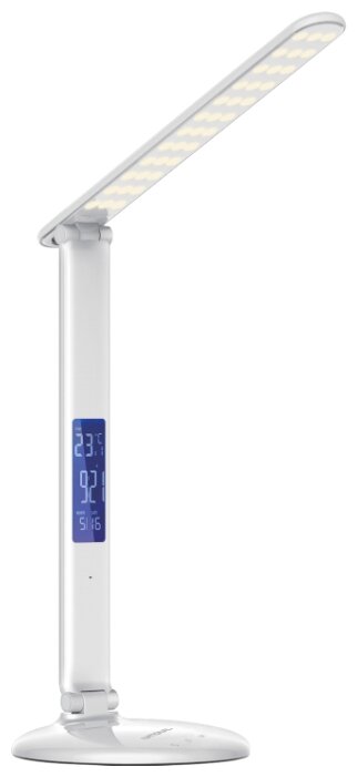 освещенность: 1250 люкс; цветовая температура (3 режима): теплый свет: 3000-3500 К, естественный свет: 4000-4500 К, холодный свет: 5500-6000 К; встроенный календарь, часы, будильник, термометр, USB-порт для зарядки мобильных устройств; питание встроенных часов: CR2032; входное напряжение адаптера питания: 100-240 В; входное напряжение светильника: 5В/2А; выходное напряжение USB: 5В/1А; срок службы светодиодов: 50 000 часов; рабочий температурный диапазон: от -10°С до +50°С; рабочая влажность: не более 98%; комплектация: светильник, адаптер питания, гарантийный талон; размер упаковки (ВхШхГ): 42,5x17,5x6 см