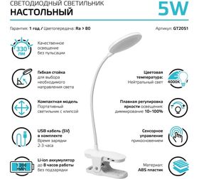 Настольный диммируемый светильник Gauss модель gtl205 5w 330lm 4000k 5v li-ion 1200ma белый led GT2051 станет незаменимым помощником. Данный источник света не требует замены батареек, он светит в течение длительного времени до следующей подзарядки, а также легко заряжается.