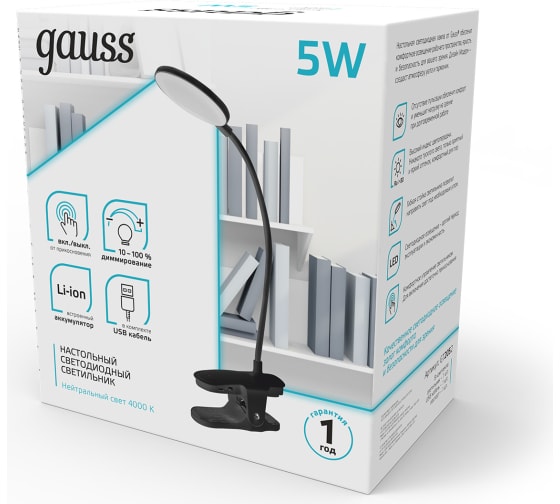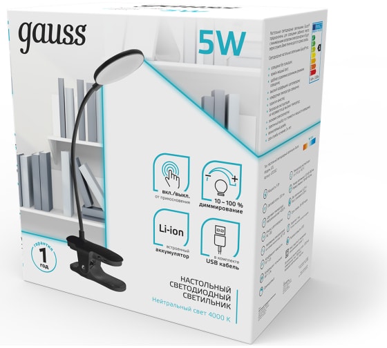 Настольная лампа от Gauss на прищепке оснащена встроенным аккумулятором. Аккумулятор Li-ion имеет большой запас емкости и легкий вес.