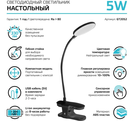 Настольный диммируемый светильник Gauss модель gtl205 5w 330lm 4000k 5v li-ion 1200ma черный led GT2052 станет незаменимым помощником. Данный источник света не требует замены батареек, он светит в течение длительного времени до следующей подзарядки, а также легко заряжается.