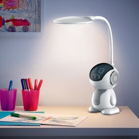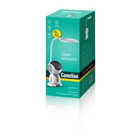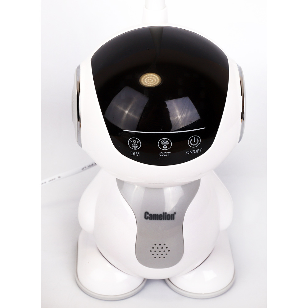 Светодиодный настольный светильник Camelion KD-858 предназначен для освещения рабочих мест детей и подростков, мест учёбы, чтения , занятия творчеством. Устойчивый корпус светильника изготовлен из прочного и безопасного ABS-пластика, гибкая металлическая стойка в силиконовом кожухе позволяет регулировать угол наклона плафона дисковой формы ( диаметром 130 мм). Основание светильника изготовлено в виде забавного робота, на голове которого находятся три сенсорные кнопки управления – ON/OFF ( включение /выключение), CCT ( регулировка цветовой температуры 3000К,4000К,6000К ), DIM ( регулировка яркости- 3 уровня). Во время работы светильника ( режим “ON”) два глаза робота светятся, они мигают в моменты включения/выключения и переключения режимов работы светильника. Мощность светильника 8 Вт, максимальный световой поток 500 лм.