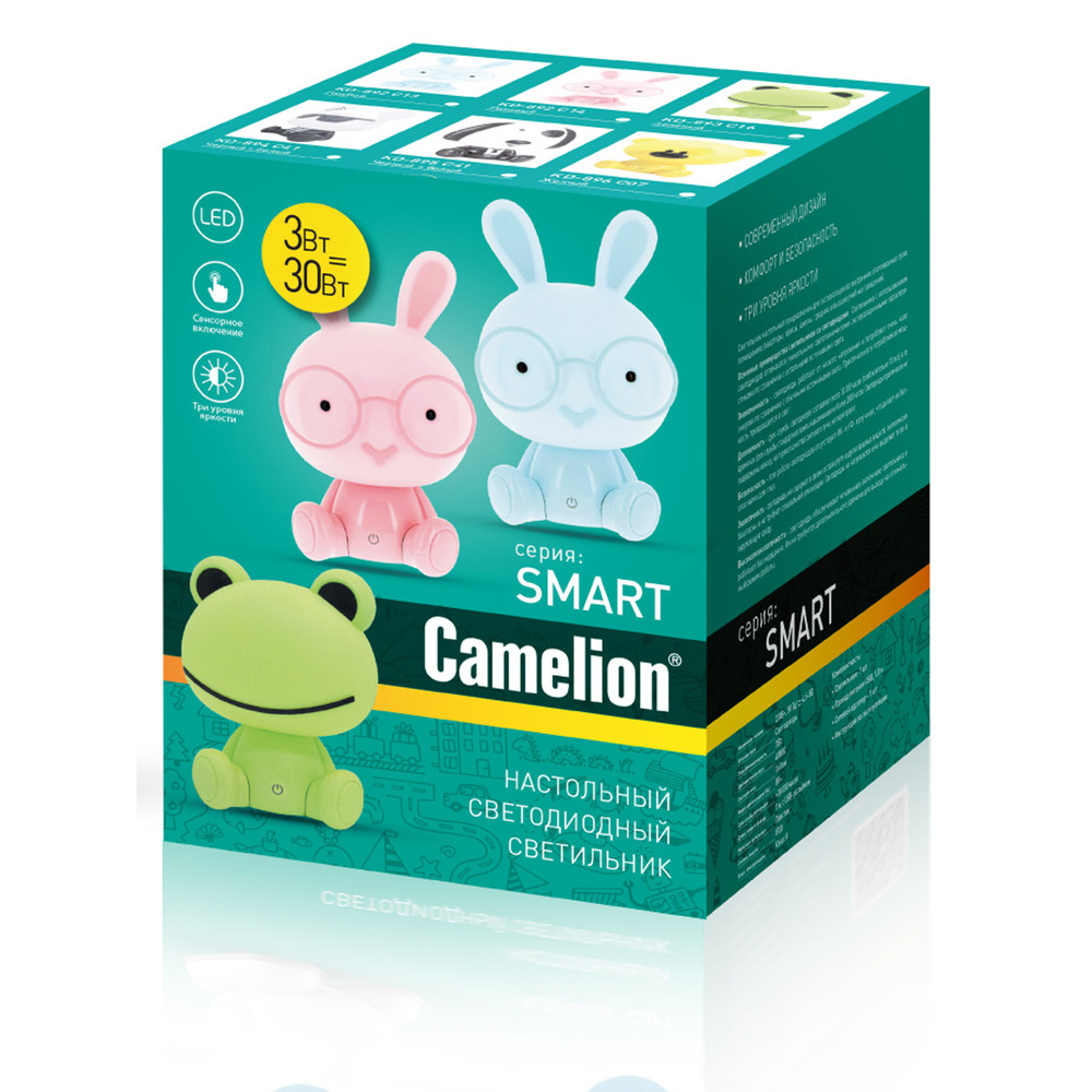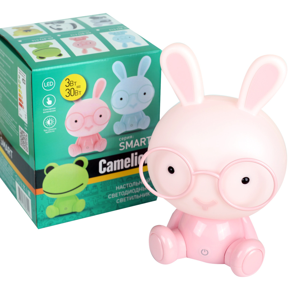 Декоративный светодиодный настольный светильник Camelion KD-892 предназначен для местной подсветки и украшения интерьера комнаты ребенка, может использоваться в качестве ночника. Используется во внутренних сухих помещениях ( степень защиты - IP 20). Корпус светильника изготовлен в виде забавного зайца в очках, голова которого является плафоном. Сенсорная кнопка включения /выключения / регулировки яркости находится на передней части основания.
