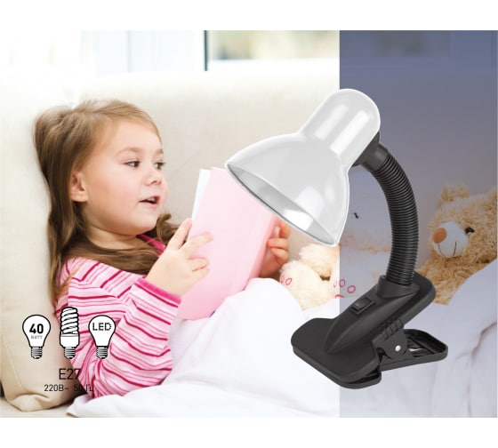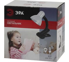 Настольный светильник ЭРА N-102-E27-40W-W белый C0041423 с гибкой стойкой, которая обеспечивает наклон и поворот плафона в любом направлении. Выключатель на прищепке. Предназначен для использования с лампой накаливания или компактной люминесцентной лампой (КЛЛ). Лампа в комплект не входит.