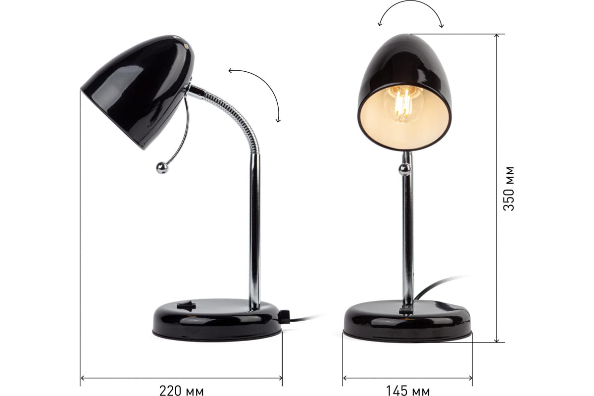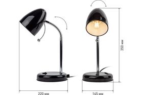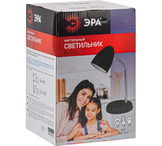 Настольный светильник ЭРА N-116-Е27-40W-BK черный Б0047201 может использоваться с лампой накаливания, компактной люминесцентной лампой (КЛЛ) или светодиодной (LED) лампой. У светильника металлические стойка и плафон, выключатель на основании. Высота расположения плафона регулируется сгибающейся стойкой, направление света - наклоном и поворотом плафона в любом направлении.