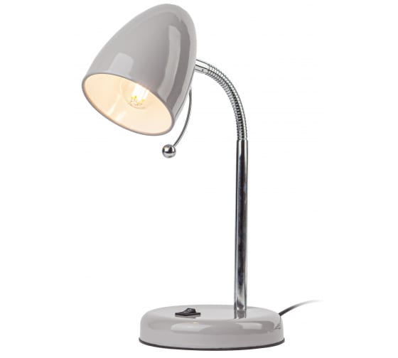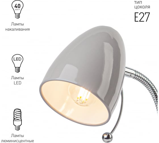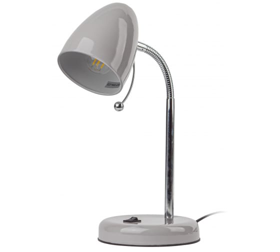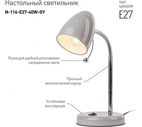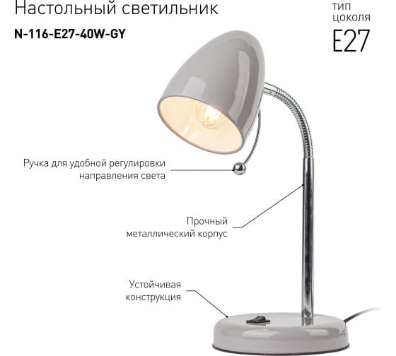 Настольный светильник ЭРА N-116-Е27-40W-GY серый Б0047203 компактного размера для удобного размещения на столе. Может использоваться с лампой накаливания, компактной люминесцентной лампой (КЛЛ) или светодиодной (LED) лампой. У светильника металлические стойка и плафон, выключатель на основании. Высота расположения плафона регулируется сгибающейся стойкой, направление света - наклоном и поворотом плафона в любом направлении.