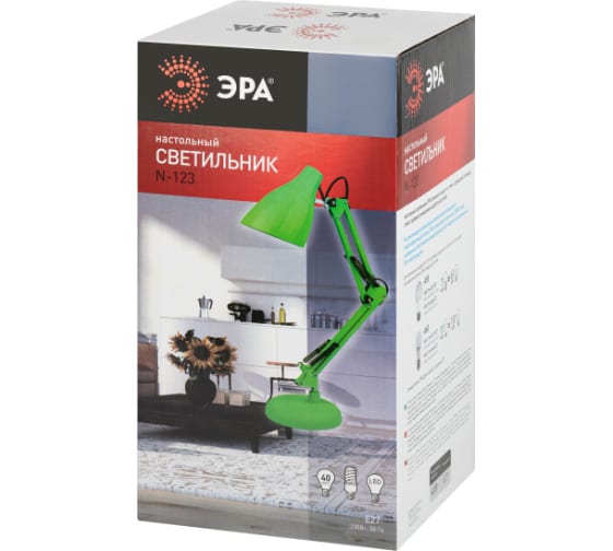 Настольный светильник ЭРА N-123-E27-40W-GR трендового дизайна с классической конструкцией может использоваться с разными источниками света - лампой накаливания, компактной люминесцентной лампой (КЛЛ) или светодиодной (LED) лампой. Выключатель на проводе. Устойчивое основание. Высота плафона регулируется двухсекционной сгибающейся стойкой, направление света - поворотом и наклоном плафона в любом направлении.