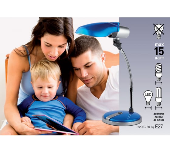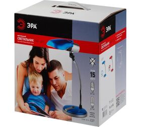 Настольный светильник ЭРА NE-301-E27-15W-BU синий C0044900 может использоваться с компактной люминесцентной лампой (КЛЛ) или светодиодной (LED) лампой (лампу накаливания в светильнике использовать нельзя). Устойчивое металлическое основание, выключатель на основании. Направление света регулируется несколькими способами для максимального комфорта. У модели современный дизайн и яркие цвета. Привлекательный эффект полупрозрачности поверхностей плафона и основания украшают интерьер и радуют глаз. Выбирайте подходящий именно вашему дому или комнате цвет, или же создайте на столе или прикроватной тумбочке яркий позитивный акцент.