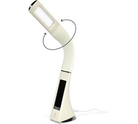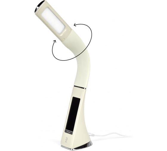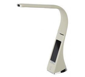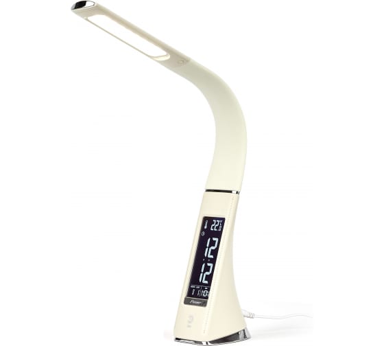 Настольный светильник ЭРА NLED-461-7W-BG бежевый Б0031611 со светодиодами (LED) в качестве источников света в дизайне под кожу. Оснащен сенсорным управлением, есть регулировки яркости освещения - 3 уровня. Главное преимущество светильника - ЖК дисплей с функциями часов, будильника, календаря и термометра. Сенсорная кнопка с обратной стороны стойки обеспечивает опцию выбора яркости дисплея с возможностью его выключения. Высота плафона регулируется гибкой стойкой, направление света регулируется поворотом плафона в любом направлении.