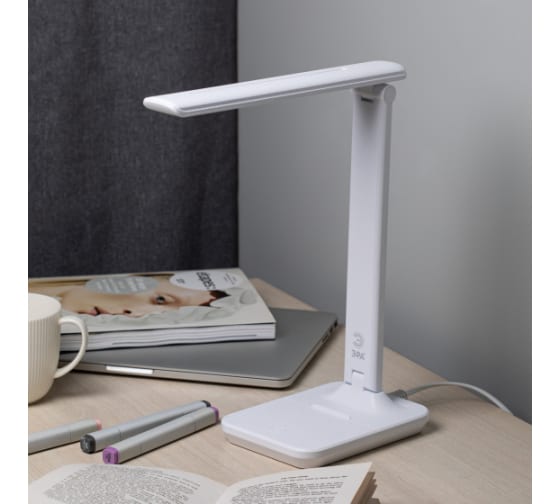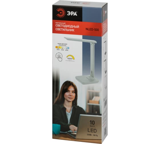 Настольный светильник ЭРА NLED-500-10W-W со светодиодами (LED) в качестве источников света в дизайне "под кожу". Удобная складная модель с сенсорным управлением, возможностью выбора цветовой температуры и плавным диммером для регулировки яркости.