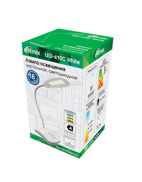 Энергосберегающая настольная лампа Ritmix LED-410С будет комфортным вариантом дополнительного освещения в комнате или на рабочем месте – для учёбы, работы, хобби, игры или отдыха. Имеет 18 ярких светодиодов со световым потоком 200 люмен. Можно регулировать световую температуру (функция ССТ), доступен выбор: 3000К (тёплый белый свет) / 4500К (естественный белый свет) / 6000К (холодный белый свет). Свет тёплого спектра хорошо подходит для уютной и расслабляющей обстановки в комнате. Свет естественного спектра соответствует дневному солнечному освещению в летний день, идеален для чтения. Свет холодного цветового спектра напоминает белое зимнее солнце. Световой поток холодного спектра воспринимается как более яркий и интенсивный. Отлично подходит для работы с документами или учёбы, повышает работоспособность, чёткость мышления и концентрацию внимания.